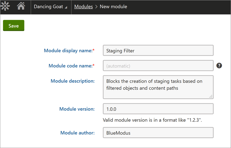 Go the Modules application and hit the New Module button. Fill out the fields as appropriate: